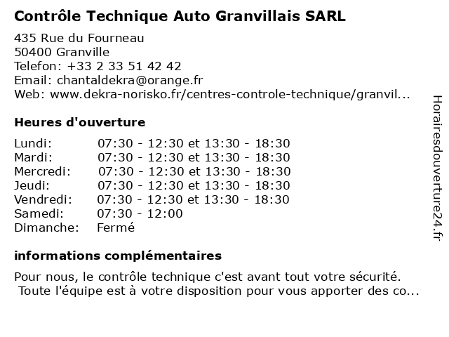 1 Centre contrôle technique DEKRA (Distance: 0,02 km) 453 Rue du Fourneau, 50400 Granville 4x4, camping car, centre, collection, contrôle, dekra, diesel, electrique, essence, gazole, suv, technique, utilitaire, voiture 2 La Civette de Granville (Distance: 2,86 km) 45 Rue Paul Poirier, 50400 Granville boissons, civette, de, débits, granvillais, granville, la, pelican 3 Auto Sécurité (Distance: 2,78 km) 699 ROUTE DE VILLEDIEU, 50400 GRANVILLE YQUELON auto, automobiles, contrôle technique, motos, sécurité 4 Confort Auto / Desclos Pneus Service (Distance: 18,69 km) 25 Pavé, 50300 Marcey les Grèves auto, automobile, automoto, autovision, confort, contrôle technique, desclos, pneus, service 5 Autovision (Distance: 49,49 km) - La Détourbe, 50160 St-Amand automobile, autovision, contrôle technique 6 Securitest (Distance: 53,89 km) 7 Boulevard de Preval, 22000 Dinan automobiles, controle technique, motos, securitest |