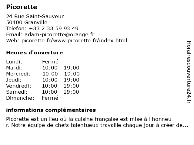 1 Picorette (Distance: 0,00 km) 22-24 Rue Saint Sauveur, 50400 Granville bar, bistrot, brasserie, café, cuisine, picorette, restaurant, restauration |