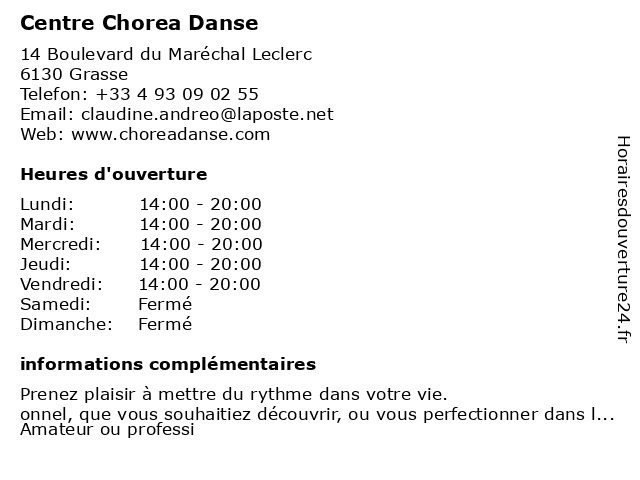 1 Club Esterel Danse Sportive C.E.D.S (Distance: 5,59 km) 16 Rue du Portail, 06810 Auribeau-sur-Siagne c.e.d.s, club, danse, esterel, sportive 3 Vis Ta Danse (Distance: 10,90 km) 3301 Allée Hélène Boucher, 06210 Mandelieu-la-Napoule classique, danse, hip-hop, mandelieu-la-napoule, ragga, ta, vis, école 4 Mougins en Danse (Distance: 11,78 km) 23 Rue du Cherche Midi, 06250 Mougins cours, danse, en, mougins, services, école 5 Centre de Danse - Studio Art 13 (Distance: 12,77 km) 39 Avenue Saint-Louis, 06400 Cannes 13, art, art 13, cannes, centre, cours, danse, de, services, studio, école 6 Studio de Danse Yoga Gym (Distance: 12,95 km) 33 Boulevard Carnot, 06400 Cannes danse, de, exercice, gym, mouvement, santé, studio, yoga |