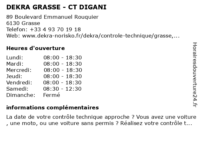 Description de l'entreprise :Préparer votre contrôle techniquePour préparer votre contrôle technique dans notre centre DEKRA de Grasse, vous pouvez vérifier en amont différents points comme les pneumatiques, la visibilité, le niveau d'huile ou encore l'habitacle. Pour tout savoir, consultez notre vidéo. Voir l'offre |