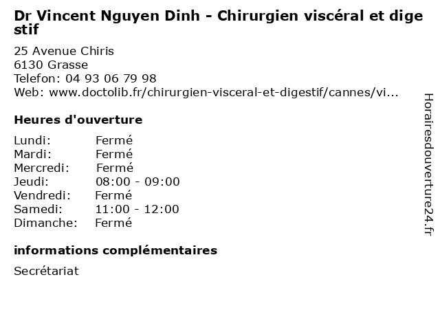1 Dr Vincent Nguyen Dinh - Chirurgien viscéral et digestif (Distance: 12,98 km) 33 Boulevard d'Oxford, 06400 Cannes chirurgie, chirurgien, digestif, dinh, dr, et, general, nguyen, soins, vincent, viscéral 2 Tavolaro Gabriel Vincent (Distance: 0,66 km) Lycee Francis De Croiset, 06130 Grasse gabriel, restaurants, tavolaro, vincent 3 Dr. Joël Nguyen - Pédiatre (Distance: 4,57 km) - Chemin de Clavary, 06130 Grasse consultation, docteur, dr., joël, med, médecin, médecine, nguyen, pédiatre, traitement 5 Nguyen Duy (Distance: 10,42 km) 105 Avenue Franklin Roosevelt, 06110 Le Cannet duy, nguyen, restaurants 6 Nguyen Phu Hai (Distance: 15,09 km) 23 Boulevard Alexandre Iii, 06400 Cannes hai, nguyen, phu, restaurants |