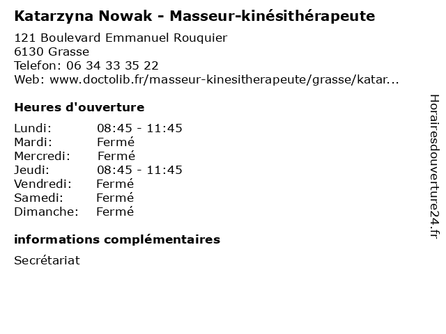 1 Dr Katarzyna Jamroz - Chirurgien-dentiste (Distance: 11,26 km) 13 Rue des Serbes, 06400 Cannes chirurgien, dent, dentiste, docteur, dr, jamroz, katarzyna, soins 2 Majewska Igwe Katarzyna (Distance: 26,32 km) B5 Residence Le Manoir, 06730 Saint Andre De La Roche igwe, katarzyna, majewska, restaurants 3 Dr Katarzyna Tanguy - Anesthésiste réanimatrice (Distance: 29,01 km) 7 Avenue Roi Albert 1er, 06100 Nice anes, anesthésiste, dr, katarzyna, réa, réanimateur, réanimatrice, tanguy 4 Jérémy Cazaux - Masseur-kinésithérapeute (Distance: nan km) 121 Boulevard Emmanuel Rouquier, 06130 Grasse cazaux, jérémy, kiné, kinésithérapeute, masseur, rééducation, soin 5 Richard Chahinian - Masseur-kinésithérapeute (Distance: nan km) 121 Boulevard Emmanuel Rouquier, 06130 Grasse chahinian, kiné, kinésithérapeute, masseur, richard, rééducation, soin 6 Giovanni Zurlo - Masseur-kinésithérapeute (Distance: nan km) 121 Boulevard Emmanuel Rouquier, 06130 Grasse consultation, docteur, giovanni, kinésithérapeute, masseur, med, médecin, médecine, traitement, zurlo |