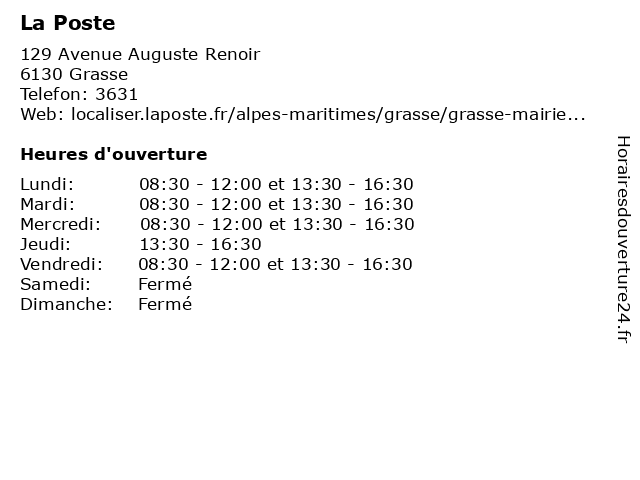 3 La Poste (Distance: 3,04 km) 19 Avenue du Général de Gaulle, 06620 Le Bar-sur-Loup agence, assurance, banque, banque postale, bureau de poste, chronopost, colis, courrier, dps, expéditions internationales, la, point, postale, poste, relais, timbres, téléphonie, ups, western union 5 La Poste (Distance: 4,36 km) 4 Avenue Louis Cauvin, 06130 Grasse agence, assurance, banque, banque postale, bureau de poste, chronopost, colis, courrier, dps, expéditions internationales, la, point, postale, poste, relais, timbres, téléphonie, ups, western union 6 La Poste (Distance: 4,39 km) 1 Place Victoria, 06620 Gourdon agence postale, courrier postal, expédition internationale, la, poste |