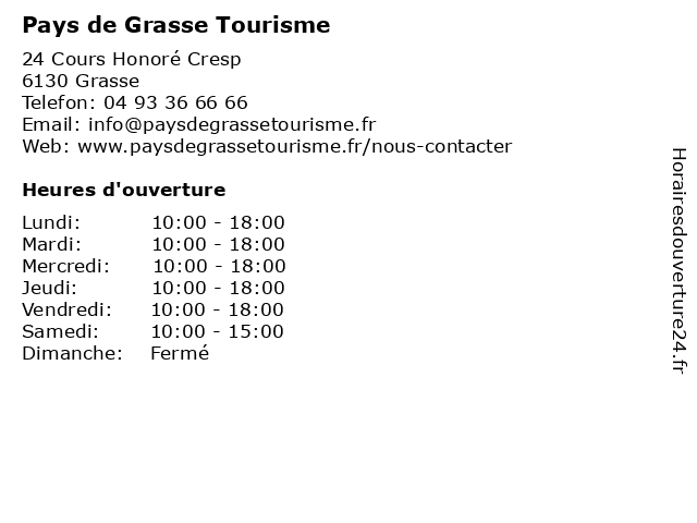 1 Pays de Grasse Tourisme (Distance: 0,29 km) 18 Place aux Aires, 06130 Grasse conseil, de, grasse, information, office, pays, renseignement, tourisme, ville, visite 2 Communauté d'agglomération - Pays de Grasse (Distance: 0,85 km) 57 Avenue Pierre Semard, 06131 Grasse administration, communauté, communes, d'agglomération, de, du, grasse, pays, services publics 3 Office de Tourisme - Juillet, août et vacances scolaires (Distance: 11,07 km) - Lac de St Cassien, 83440 Tanneron août, de, et, horaires des musées, juillet, office, restaurants, scolaires, tourisme, transports, vacances 4 Office de Tourisme - Hors saison (octobre à mars) (Distance: 11,07 km) - Lac de St Cassien, 83440 Tanneron de, horaires des musées, hors, mars, octobre, office, restaurants, saison, tourisme, transports 5 Office de Tourisme - De janvier à mars et de novembre à décembre (Distance: 13,32 km) - Place du Clos, 83440 Montauroux de, décembre, et, horaires des musées, janvier, mars, novembre, office, restaurants, tourisme, transports 6 Office de Tourisme - D'avril à juin et de septembre à octobre (Distance: 13,32 km) - Place du Clos, 83440 Montauroux d'avril, de, et, horaires des musées, juin, octobre, office, restaurants, septembre, tourisme, transports |