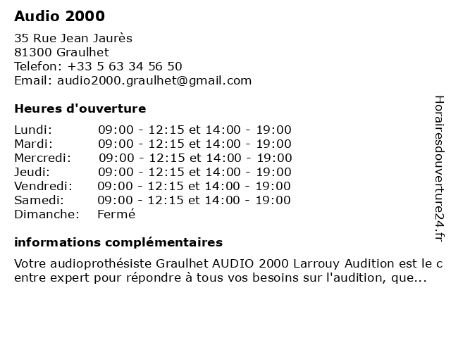 | Samedi | 09:00-12:15 et 14:00-19:00 |