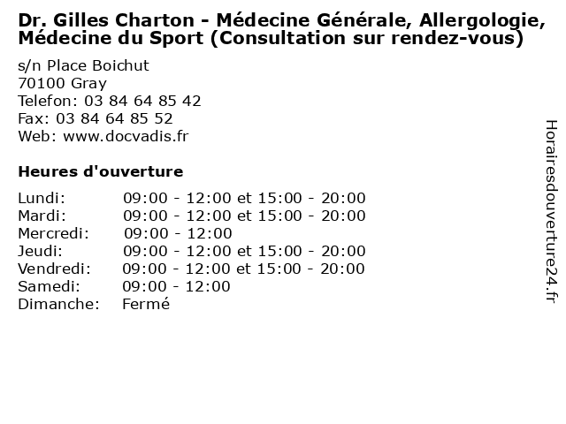 1 Gray Optique Photo - Optic Chez Vous (Distance: 0,54 km) 26 Rue Thiers, 70100 Gray chez, gray, optic, optique, photo, vous 5 Dr. Jean-Luc BOITEUX - Médecine générale (Consultation sur rendez-vous) (Distance: 16,59 km) s/n Pré l'Évêque,, 70700 Gy boiteux, consultation, docteur, dr., générale, jean, luc, medecins, médecine, rendez, santé, sur, vous 6 Dr. Pascal VUILLEMIN - Médecine générale (Consultation sur rendez-vous) (Distance: 16,59 km) s/n Pré l'Évêque, 70700 Gy consultation, docteur, dr., générale, medecins, médecine, pascal, rendez, santé, sur, vous, vuillemin |