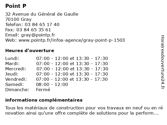 1 Point P (Distance: 19,39 km) . Route de Vantoux, 70700 Velleclaire aménagement, construction, matériaux, point, quinçaillerie, équipement 2 Christelle Quinçaillerie (Distance: 20,88 km) 1 Avenue de Marnay, 70150 Marnay accessoires, art de table, bricolage, cadeaux, christelle, droguerie, décoration, jardin, maison, quinçaillerie 3 Point P (Distance: 47,92 km) 1 Rue de l'Industrie, 70000 Vesoul aménagement, construction, matériaux, point, quinçaillerie, équipement 4 Cuisines Schmidt (Distance: 0,54 km) - Rue des Frères Lumières, 70100 Gray aménagement, cuisine, cuisines, cuisiniste, intérieur, schmidt, équipement 5 ABCD Géomètres Experts et Ingénierie - Gray (Distance: 1,40 km) 15 Rue Thiers, 70100 Gray abcd, architecte-paysagiste, conseil en construction, et, experts, gray, géomètres, ingénierie, ingénieur civil, paysagiste 6 Espace Aubade (Magasin) (Distance: 2,02 km) . Avenue des Parcs, 70100 Arc Les Gray aménagement, aubade, equipement, espace, magasin, mobilier |