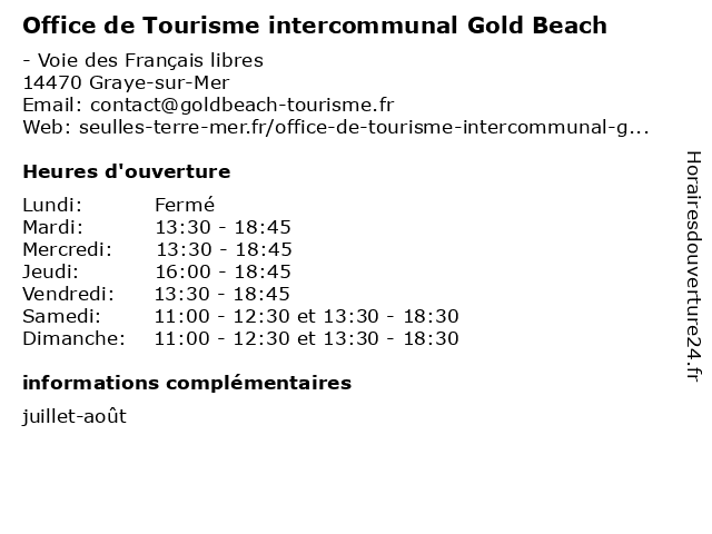 1 Office de Tourisme intercommunal Gold Beach (Distance: 7,82 km) 12 place Edmond Paillaud, 14960 Asnelles beach, de, gold, information, intercommunal, office, renseignement, tourisme, touristique 2 Office de Tourisme intercommunal Gold Beach (Distance: 8,57 km) - Cale de l’Essex Yeomanry, 14960 Asnelles beach, de, gold, information, intercommunal, office, renseignement, tourisme, touristique 3 Centre Juno Beach (Distance: 0,23 km) Voie des Français Libres, 14470 Courseulles-sur-Mer beach, centre, juno 4 Office de tourisme - Coeur de Nacre Tourisme (Distance: 0,54 km) 5 rue du 11 Novembre, 14470 Courseulles-sur-Mer coeur, de, information, nacre, office, renseignement, tourisme, touristique 5 Office de Tourisme - Ver-sur-Mer (Ete) (Distance: 4,38 km) 2 Place de l'Amiral-Byrd, 14114 Ver-sur-Mer bureaux, de, ete, mer, office, services, sur, tourisme, ver 6 Office de Tourisme d'Arromanches (Distance: 11,42 km) 2 rue Maréchal Joffre, 14117 Arromanches-les-Bains 1er, 31, aout, au, aôut, d'arromanches, de, et, horaires des musées, juillet, office, restaurants, tourisme, transports |