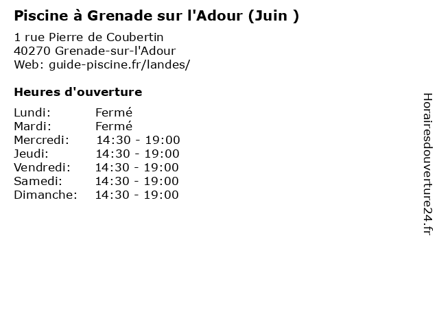 1 Piscine à Grenade sur l'Adour (Juillet et août ) (Distance: 0,00 km) 1 rue Pierre de Coubertin, 40270 Grenade-sur-l'Adour août, et, grenade, juillet, l'adour, natation sportive, piscine, sportif, sur 2 Piscine à Mont de Marsan (Période scolaire) (Distance: 14,45 km) - rue Sarraute, 40000 Mont-de-Marsan de, marsan, mont, natation sportive, piscine, période, scolaire, sportif 3 Base nautique du Marsan à Saint Pierre du Mont (Du 18 juin au 4 septembre) (Distance: 14,93 km) - route de Bayonne, 40280 Saint-Pierre-du-Mont 18, au, base, du, juin, marsan, mont, natation sportive, nautique, pierre, piscine, saint, septembre, sportif 4 Piscine à Geaune (Juin ) (Distance: 15,64 km) 4 chemin de la piscine, 40320 Geaune geaune, juin, natation sportive, piscine, sportif 5 Piscine à Geaune (Juillet et août ) (Distance: 15,64 km) 4 chemin de la piscine, 40320 Geaune août, et, geaune, juillet, natation sportive, piscine, sportif 6 Musée Départemental de la Faïence et des Arts de la Table - du 1 juin au 30 septembre (Distance: 15,78 km) 2378 Route d'Hagetmau, 40320 Samadet 30, arts, au, de, des, du, départemental, et, exposition, faïence, juin, la, musée, septembre, table, visite |