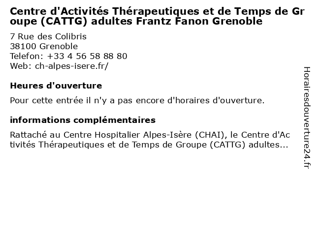 Termes de recherche pour Centre d'Activités Thérapeutiques et de Temps de Groupe (CATTG) adultes Frantz Fanon Grenoble:et, de, centre, temps, groupe, grenoble, frantz, adultes, d'activites, fanon, therapeutiques, cattg |