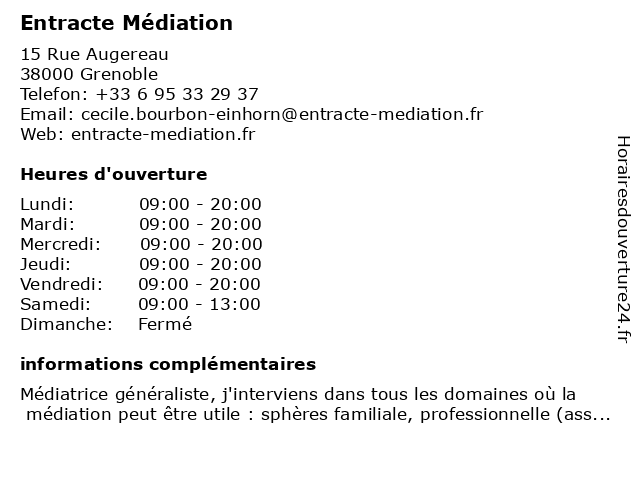 1 L'Entracte (Distance: 39,25 km) 15 Av Dr c Gabriel Pravaz, 38480 Le Pont De Beauvoisin entracte, marcelle, renee, restaurants, rouzaud 2 CASA SERRA byl'Entracte (Distance: 45,43 km) 34 Rue du Verger, 73000 Chambéry byl'entracte, casa, serra 3 Médiation Familiale (AEMF) (Distance: 54,42 km) 2 Avenue ville de Mindelheim, 26300 Bourg-de-Péage aemf, familiale, médiation 4 Médiation Familiale (AEMF) (Distance: 54,85 km) 7 Rue des Fabriques, 26150 Die aemf, familiale, médiation 5 Association Isis Nord Isère (Distance: 56,71 km) 33 Rue du tribunal, 38300 Bourgoin-Jallieu aide, association, isis, isère, médiation, nord, victimes 6 ARIM Association Rencontre Information Médiation (Distance: 57,08 km) 5 Rue des Charmettes, 38300 Bourgoin-Jallieu arim, association, information, médiation, rencontre |