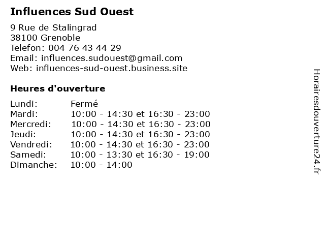 | Mardi | 10:00-14:30 et 16:30-23:00 |