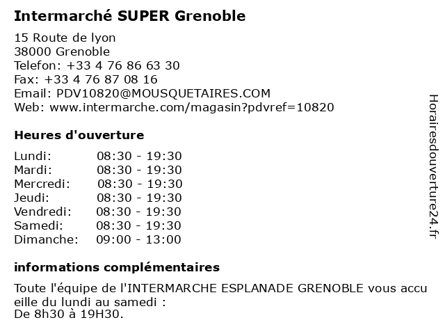 1 Intermarché SUPER Grenoble (Distance: 1,65 km) 13 Boulevard du maréchal foch, 38100 Grenoble grenoble, intermarché, super 2 Intermarché SUPER Grenoble (Distance: 2,43 km) 13 Chemin Barral, 38100 Grenoble grenoble, intermarché, super 3 Alimentation Super Bastille (Distance: 0,44 km) 8 Cours Jean Jaurès, 38000 Grenoble alimentation, bastille, distributeur, magasin, shopping, super, vente 4 Super Good (Distance: 0,85 km) 2 Rue De Lionne, 38000 Grenoble balkans, denis, good, miftari, restaurants, sarajevo, super 5 Super U Location (Distance: 1,25 km) 10 Rue Hoche, 38000 Grenoble location, super, transport, utilitaire, véhicule 6 |