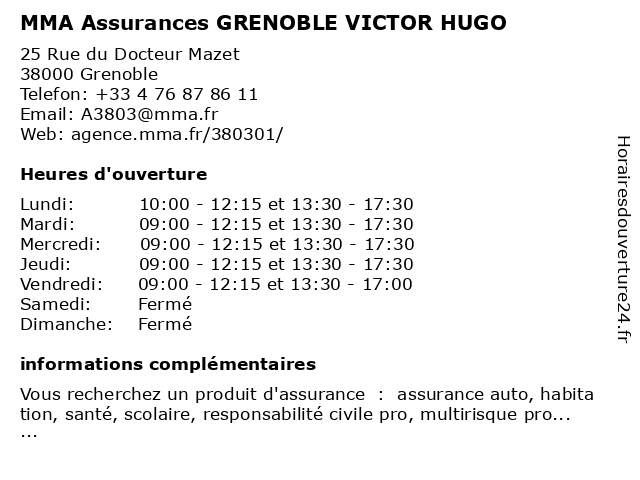 1 MAAF Assurances GRENOBLE GAMBETTA (Distance: 0,06 km) 17 Boulevard Gambetta, 38000 Grenoble assurance, assurance auto, assurance habitation, assurance moto, assurance professionnelle, assurance prêt immobilier, assurances, crédit auto, gambetta, grenoble, maaf, mutuelle, mutuelle santé 2 Century 21- Victor Hugo (Distance: 0,09 km) 28 Boulevard Edouard Rey, 38000 Grenoble 21, achat, agence, appartement, bailleur, century, gestion, hugo, immobilier, immobilière, location, locative, maison, vente, victor 3 GMF Assurances (Distance: 0,16 km) 7 Avenue Félix Viallet, 38000 Grenoble assurance auto, assurance habitation, assurance santé, assurances, crédit, devis en ligne, gmf, prise de rendez-vous, prévoyance, épargne 4 MFA - Mutuelle Fraternelle d'Assurances (Distance: 0,19 km) 16 avenue Felix Viallet, 38000 Grenoble agence, assurances, compagnie, contrat, courtiers, d'assurances, fraternelle, mfa, mutuelle, protection 5 HUGO BOSS Shop (Distance: 0,20 km) 5, Place Victor Hugo, 38000 Grenoble accessoires, bags, boss, hugo, menswear, perfumes, shoes, shop, watches, womenswear 6 Pharmacie Victor Hugo (Distance: 0,20 km) 9 Place Victor Hugo, 38000 Grenoble aromathérapie, heboristerie, hugo, médical, médicaments, ordonnances, paramédical, parapharmacie, pharmacie, pharmacien, santé, traitement, traitements, victor |