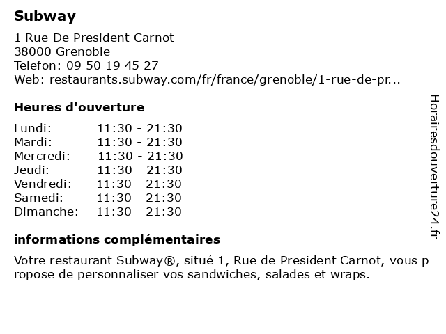 1 Subway (Distance: 1,13 km) 25 Rue Berthe De Boissieux, 38000 Grenoble fast-food, restaurant à emporter, restaurants, subway 2 Subway (Distance: 1,42 km) 140 Avenue Gabriel Péri, 38400 Saint Martin d'Hères rapide, restaurant, restauration, subway 3 Subway (Distance: 3,09 km) 7 rue Charles Darwin, 38400 St Martin d'Heres alimentaires, boissons, subway 4 Subway (Distance: 5,03 km) 2 Rue Albert Londres, 38130 Echirolles fast-food, restaurant à emporter, restaurants, subway 5 Le Subway (Distance: 0,82 km) 2 Rue Lakanal, 38000 Grenoble bar, boissons, cocktail, le, musique, pub, restauran, subway 6 Subway - Closed (Distance: 1,31 km) Gare de grenoble, 38000 Grenoble closed, fast-food, restaurant à emporter, restaurants, subway |