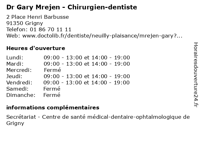 1 Dr Mickael Mrejen - Chirurgien-dentiste (Distance: 0,00 km) 2 Place Henri Barbusse, 91350 Grigny chirurgien, dentaire, dentiste, dr, implantologie, mickael, mrejen, parodontologie 2 Gary Gauthier - Artisan couvreur zingueur 91 (Distance: 8,70 km) 56 bis rue des Moulins, 91310 Montlhéry 91, artisan, couvreur, démoussage, gary, gauthier, toiture, travaux, zingueur 3 Dr Gary Mamou - Chirurgien-dentiste - secrétariat (Distance: 11,78 km) - Avenue du Luxembourg, 94320 Thiais chirurgien, consultation, dentiste, docteur, dr, gary, mamou, med, médecin, médecine, secrétariat, traitement 4 École élémentaire Romain Gary (Distance: 12,59 km) 6 Rue Romain Gary, 94320 Thiais ecole, education, gary, romain, services, école, élémentaire 5 Pharmacie Romain Gary (Distance: 12,60 km) 1 Rue Marcel Cerdan, 94320 Thiais gary, homéopathie, médicaments, orthopédie, parapharmacie, pharmacie, romain 6 École Maternelle Publique Romain Gary (Distance: 12,61 km) 1 Rue Romain Gary, 94320 Thiais cours, education, gary, maternelle, publique, romain, services, École, école |