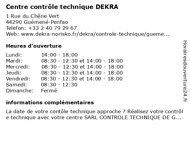 Description de l'entreprise :Préparer votre contrôle techniquePour préparer votre contrôle technique dans notre centre DEKRA de Guémené-Penfao, vous pouvez vérifier en amont différents points comme les pneumatiques, la visibilité, le niveau d'huile ou encore l'habitacle. Pour tout savoir, consultez notre vidéo. Voir l'offre |