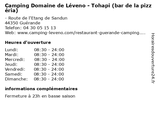 1 Camping Domaine de Léveno - Tohapi (Epicerie) (Distance: 0,00 km) - Route de l'Etang de Sandun, 44350 Guérande camping, de, domaine, epicerie, hebergement, léveno, restauration, tohapi, tourisme 2 Camping Domaine de Léveno - Tohapi (Vente à emporter – Snack ) (Distance: 0,00 km) - Route de l'Etang de Sandun, 44350 Guérande camping, de, domaine, emporter, hebergement, léveno, restauration, snack, tohapi, tourisme, vente 3 Camping Domaine de Léveno - Tohapi (restaurant-pizzéria) (Distance: 0,00 km) - Route de l'Etang de Sandun, 44350 Guérande camping, de, domaine, hebergement, léveno, pizzéria, restaurant, restauration, tohapi, tourisme 4 Camping Domaine de Léveno - Tohapi (Bar/Restaurant) (Distance: 0,00 km) - Route de l'Etang de Sandun, 44350 Guérande bar/restaurant, camping, de, domaine, hebergement, léveno, restauration, tohapi, tourisme 5 Camping Domaine de Léveno - Tohapi (Distance: 0,00 km) - Route de l'Etang de Sandun, 44350 Guérande camping, de, domaine, hebergement, léveno, restauration, tohapi, tourisme 6 Camping Domaine d'Inly - Tohapi (Epicerie, basse saison) (Distance: 17,43 km) - Route de Couarne, 56760 Pénestin basse, camping, d'inly, domaine, epicerie, hebergement, restauration, saison, tohapi, tourisme |