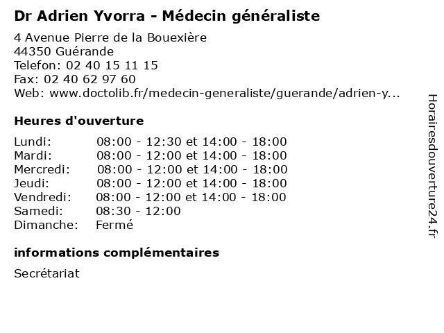 | Lundi | 08:00-12:30 et 14:00-18:00 |