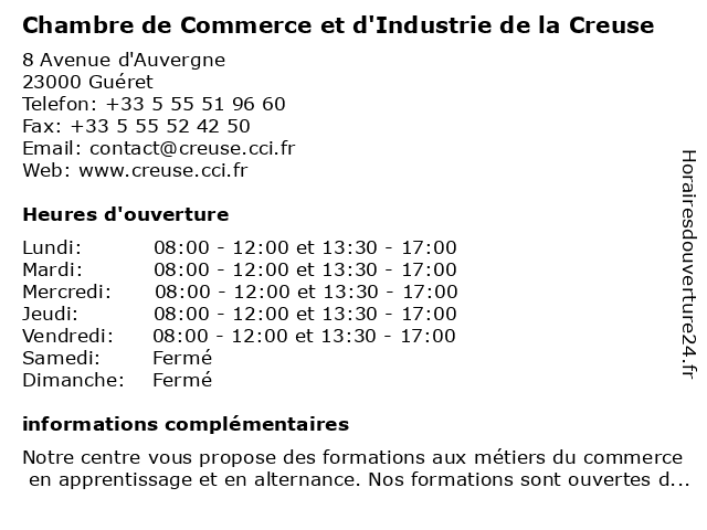 1 Chambre d'Agriculture de la Creuse (Distance: 0,01 km) 8 avenue d'Auvergne, 23000 Guéret agriculteur, agriculture, chambre, creuse, d'agriculture, de, la, organisation 2 Chambre d'Agriculture (Distance: 0,01 km) 8 Avenue d'Auvergne, 23000 Gueret administration, assoc, chambre, d'agriculture, services, services publics 3 Chambre de Métiers et de l'Artisanat Nouvelle-Aquitaine / Creuse (Distance: 0,01 km) 8 Avenue d'Auvergne, 23000 Guéret aquitaine, chambre, creuse, de, et, l'artisanat, métiers, nouvelle 4 Capeb 23 Chambre Artisanale des petites entreprises du bâtiment (Distance: 0,11 km) 28 Avenue d'Auvergne, 23000 Guéret 23, artisanale, bâtiment, capeb, chambre, des, du, entreprises, petites 5 Greffe du Tribunal de Commerce (Distance: 1,01 km) 23 Place Bonnyaud, 23000 Guéret administration, commerce, de, du, greffe, services, services publics, tribunal 6 Ambiance Cuisines Contarin (Distance: 1,00 km) 55 Avenue du Berry, 23000 Guéret ambiance, ameublement, chambre, contarin, cuisine, cuisines, magasin, séjour |