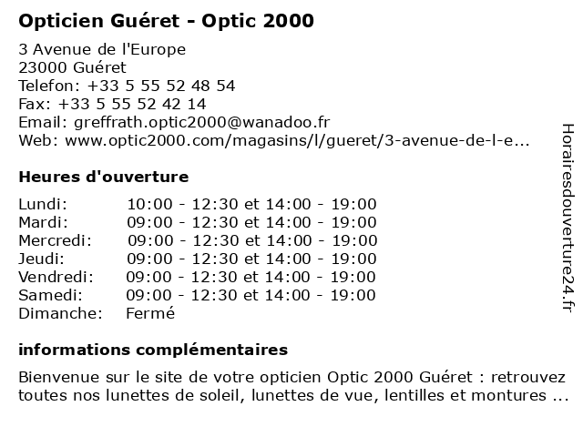 2 Opticien Générale d'Optique (Distance: 0,20 km) 36/40 Avenue du Berry, 23000 Guéret d'optique, générale, opticien 3 Opticien Guéret | Alain Afflelou (Distance: 0,29 km) 36 Avenue Du Berry, 23000 Guéret afflelou, alain, cabinet d'ophtalmologie, guéret, magasin de lunettes de soleil, ophtalmologie, opticien, optométrie 4 Opticien GUÉRET Optical Center (Distance: 0,44 km) 8 Avenue du Berry, 23000 Guéret center, guéret, optical, opticien 6 Sport 2000 (Distance: 0,80 km) - Rue Emile Bouant, 23000 Gueret 2000, course à pied, mode, multisport, sport |