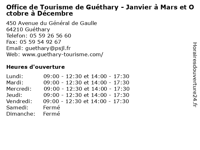 1 Office de Tourisme de Guéthary - Avril à Juin et Septembre (Distance: 0,00 km) 450 Avenue du Général de Gaulle, 64210 Guéthary avril, de, et, guéthary, horaires, juin, musées, office, périodes, restaurants, septembre, tourisme, transports 2 Office de Tourisme de Guéthary - Juillet et Août (Distance: 0,00 km) 450 Avenue du Général de Gaulle, 64210 Guéthary août, de, et, guéthary, horaires, juillet, musées, office, période, restaurants, tourisme, transports 3 Musée de Guéthary - Mai, Juin, Septembre, Octobre (Distance: 0,26 km) 165 Avenue du Général de Gaulle, 64210 Guéthary de, exposition, guéthary, juin, mai, musée, octobre, septembre, visite 4 Hôtel Amaryz - Restaurant avril à octobre (Inter-Hôtel) (Distance: 6,77 km) - Boulevard Marcel Dassault, 64200 Biarritz 1er, 31, amaryz, au, avril, hebergement, hotel, hôtel, inter, octobre, restaurant 5 Office de Tourisme d'Ascain - Janvier à Mars et Novembre à Décembre (Distance: 8,89 km) 23 Rue Oletako Bidea, 64310 Ascain d'ascain, de, décembre, en, et, février, horaires des musées, janvier, mars, novembre, office, restaurants, tourisme, transports 6 Office de Tourisme d'Urrugne - Janvier à Mars et Octobre à Décembre (Distance: 10,07 km) - Maison Posta, 64122 Urrugne d'urrugne, de, d’octobre, décembre, et, horaires des musées, janvier, mars, octobre, office, restaurants, tourisme, transports |