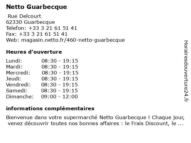 1 Netto Station Service (Distance: 0,07 km) - Rue Delcourt, 62330 Guarbecque carburant, essences, gazole, netto, service, services, station 2 Netto Campagne-les-Wardrecques (Distance: 16,12 km) 2 Rue Principale, 62120 Campagne-lès-Wardrecques campagne, les, netto, wardrecques 5 Netto (Distance: 31,13 km) - Rue de la Gare, 59143 Watten achats de produits alimentaires, des prix bas, grands supermarchés, hard discount, netto, supermarchés 6 Netto Station Service (Distance: 36,35 km) - Rue Roger Salengro, 62710 Courrières carburant, essences, gazole, netto, service, services, station |