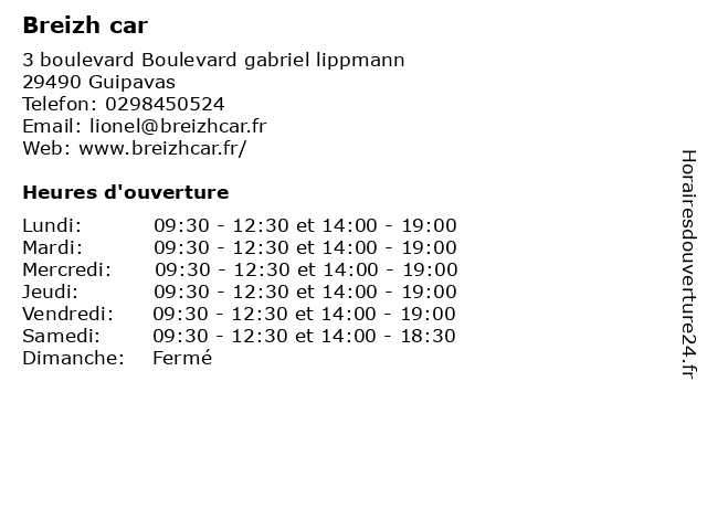 1 Centre Auto Point S - Breizh Tyres (Distance: 0,19 km) - Zone Industielle de Kercaradec, 29490 Guipavas auto, breizh, centre, controle, montage, pneu, point, révision, tyres, vente 2 American Car Wash (Distance: 0,29 km) 9 Rue Pierre Martin, 29200 Brest american, auto, car, centre, lavage, station, voiture, wash 3 Com'In Breizh (Distance: 1,16 km) 14 rue Henri Becquerel, 29590 La Faou breizh, com'in, communication, entreprises, impression, numeriques, projet 4 Top Garage - Garage Breizh Car (Distance: 1,18 km) 2 Rue Jules Jansen, 29490 Guipavas breizh, car, carrosserie, controle, entretion, garage, garage auto, réparation, top, vehicule 6 Budget Car Rental (Distance: 1,39 km) 163 Route De Gouesnou, 29200 Brest budget, car, location de voiture, location de véhicules, rental |