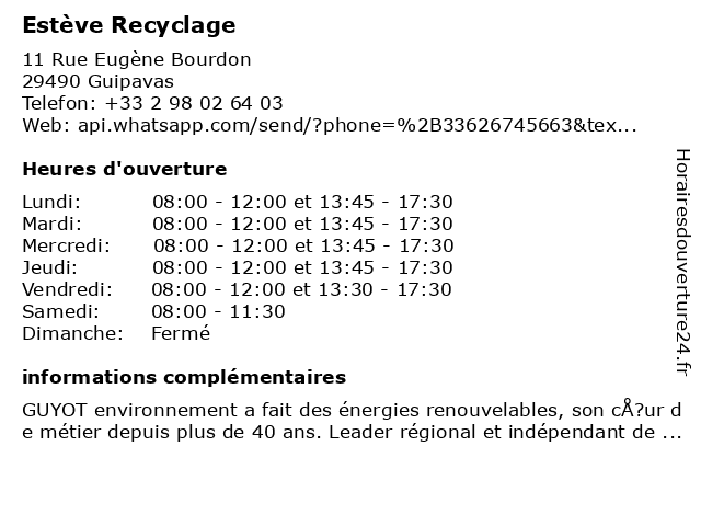 2 Agence Suez - Sanitra Fourrier (Distance: 3,78 km) - Rue Montjarret de Kerjegu, 29200 Brest agence, déchets, eau, fourrier, gestion, recyclage, sanitra, suez 3 Les Recycleurs Bretons - Siège social (Distance: 7,55 km) 170 rue Jacqueline Auriol, 29490 Guipavas agence, bretons, centre, les, recyclage, recycleurs, siège, social 4 Ac Starter (Distance: 10,35 km) - Pont Corff, 29290 Saint-Renan ac, auto, automobile, enlèvement, indra, pièce, recyclage, starter, voiture, véhicule 5 Les Recycleurs Bretons (Distance: 10,67 km) - Ty Colo, 29820 Guilers agence, bretons, centre, les, recyclage, recycleurs 6 Les Recycleurs Bretons (Distance: 19,62 km) - ZAC de Kerdanvez, 29160 Crozon agence, bretons, centre, les, recyclage, recycleurs |