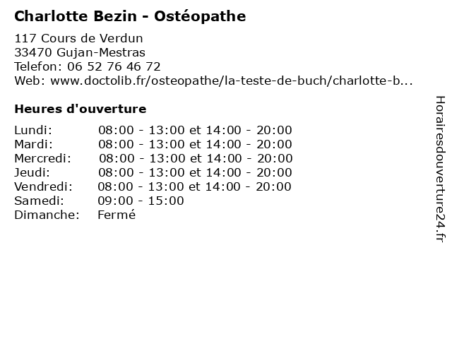 1 Charlotte Jehl - Médecin généraliste (Distance: 2,17 km) 6 Place du Vieux Marché, 33470 Gujan-Mestras charlotte, docteur, generaliste, généraliste, jehl, medecin, médecin, soins 2 Charlotte Bezin - Ostéopathe - secrétariat (Distance: 4,89 km) 1 Rue Pierre Dignac, 33260 La Teste-de-Buch bezin, care, charlotte, health, ostéopathe, secrétariat, service 3 Deschamps Charlotte (Distance: 5,52 km) 8 Rue des Chasseurs, 33260 La Teste-de-Buch charlotte, deschamps 4 Dr Charlotte Theodore - Médecin généraliste (Distance: 8,83 km) 21 Rue Michel de Montaigne, 33380 Biganos charlotte, docteur, dr, generaliste, généraliste, medical, médecin, soin, theodore 5 Plume Envol Charlotte Tornier (Distance: 13,73 km) 19 Rue des Huitriers, 33510 Andernos-les-Bains charlotte, envol, plume, tornier 6 Charlotte Chevru - Psychologue (Distance: 15,41 km) 16 Rue du Pré du Ctre, 33740 Arès charlotte, chevru, folie, psychiatre, psychiatrie, psychiatrique, psychologue |