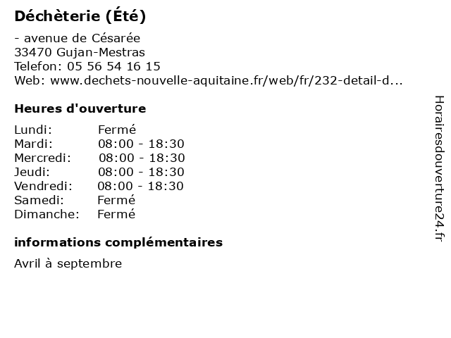 1 Déchèterie (Été) (Distance: 5,74 km) - Avenue de l'Aérodrome, 33260 La Teste-de-Buch bennes, collecte, débarras, déchets, déchèterie, ordures, été 2 Déchèterie (Été) (Distance: 6,23 km) - Boulevard Mestrezat, 33120 Arcachon bennes, collecte, débarras, déchets, déchèterie, ordures, été 3 Déchèterie (Été) (Distance: 11,02 km) - avenue de Biscarosse, 33115 Pyla-Sur-Mer bennes, collecte, débarras, déchets, déchèterie, ordures, été 4 Déchèterie (Été) (Distance: 11,74 km) 27 Allée Marie Dufaure, 33260 La Teste-de-Buch bennes, collecte, débarras, déchets, déchèterie, ordures, été 5 Déchèterie (Été) (Distance: 12,24 km) - Lieu-dit La Cassadotte, 33380 Mios bennes, collecte, déchets, déchèterie, détritus, poubelles, été 6 Déchèterie (Été) (Distance: 14,28 km) - rue Denis Papin, 33510 Andernos-les-Bains bennes, collecte, déchets, déchèterie, détritus, poubelles, été |