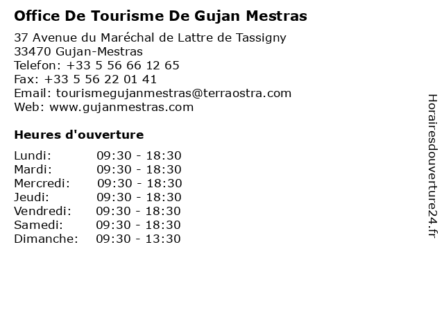 1 Maître Guillaume Loriod - Office notarial (Distance: 0,33 km) 10 Avenue du Maréchal de Lattre de Tassigny, 33470 Gujan-Mestras assoc, biens, guillaume, loriod, maître, notaire, notaires, notarial, office 2 Offices de Tourisme - Le Teich (Distance: 7,18 km) 1 Place Pierre Dubernet, 33470 Le Teich bureaux, de, le, offices, services, teich, tourisme 3 Offices de Tourisme - Le Teich (Juill-Aout) (Distance: 7,18 km) 1 Place Pierre Dubernet, 33470 Le Teich aout, bureaux, de, juill, le, offices, services, teich, tourisme 4 Office de Tourisme Coeur du Bassin d'Arcachon (Distance: 9,19 km) 20 allées Ernest de Boissière, 33980 Audenge accueil, bassin, coeur, d'arcachon, de, du, information, office, sortie, tourisme 5 Office de Tourisme Coeur du Bassin d'Arcachon (Distance: 9,45 km) 1 route du Stade, 33138 Lanton accueil, bassin, coeur, d'arcachon, de, du, information, office, sortie, tourisme 6 Office de Tourisme - 1er avril au 30 juin et 1er septembre au 31 octobre (Distance: 10,85 km) 1 rue Jean Zay, 33380 Biganos 1er, 30, 31, au, avril, de, et, horaires des musées, juin, mai, octobre, office, restaurants, septembre, tourisme, transports |