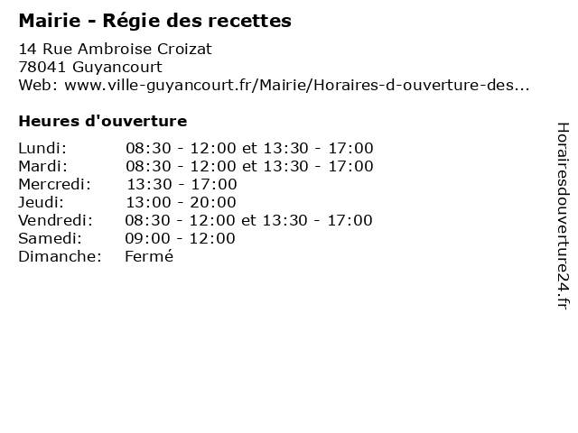 | Lundi | 08:30-12:00 et 13:30-17:00 |