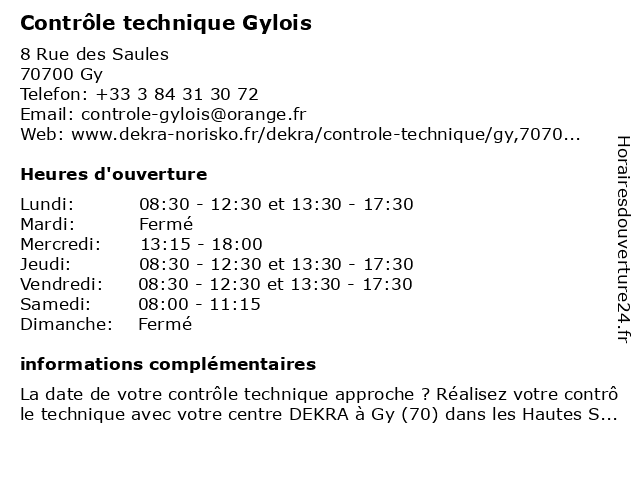 1 DEKRA contrôle technique gylois (Distance: 0,00 km) Rue des Saules, 70700 Gy contrôle, dekra, gylois, technique 2 AUTOSUR CONTROLE TECHNIQUE ANCIER (Distance: 14,29 km) 12 Rue des Varennes, 70100 Ancier ancier, autosur, centre de contrôle technique en haute-saône, controle, technique 3 Sécuritest Contrôle Technique Automobile (Distance: 15,75 km) Rue Léon Foucault, 70100 Gray automobile, centre contrôle technique, contre visite, contrôle, contrôle pollution, contrôle technique, contrôle technique automobile, securitest, sécuritest, technique, véhicules léger 4 Centre Contrôle Auto SARL (Distance: 17,02 km) 3 Rue des Giranaux, 70100 Arc-lès-Gray auto, centre, contrôle, sarl 5 Autosécuritas Brie Contrôle Technique de Voray (Distance: 17,49 km) 5 Rue des Acacias, 70190 Voray-sur-l'Ognon autosécuritas, brie, contrôle, de, technique, voray 6 Sécuritest Contrôle Technique Automobile Dampierre-sur-Salon (ex : Dekra) (Distance: 18,20 km) Z.a. De La Cote Renverse, 70180 DAMPIERRE SUR SALON automobile, contrôle, dampierre, dekra, ex, salon, sur, sécuritest, technique |