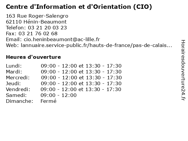 1 Centre d'Information et d'Orientation (CIO) (Distance: 9,10 km) 24 rue du 11-Novembre, 62300 Lens administration, assoc, associations, centre, cio, d'information, d'orientation, des, et, greffe, information, locale, mission, services, services publics 2 Centre d'Information et d'Orientation (CIO) (Distance: 10,20 km) 118 rue d'Arras, 59500 Douai administration, assoc, associations, centre, cio, d'information, d'orientation, des, et, greffe, information, locale, mission, services, services publics 3 Centre d'Information et d'Orientation (CIO) (Distance: 12,62 km) n/a Rue Marie-Liétard, 62800 Liévin administration, assoc, associations, centre, cio, d'information, d'orientation, des, et, greffe, information, locale, mission, services, services publics 4 Centre d'information et d'orientation (CIO) (Distance: 18,51 km) 53 Rue de Douai, 62000 Arras centre, cio, congés, d'information, d'orientation, documentation, et, information, jeunesse, metiers, orientation, scolaires, vacances 5 Point Information Jeunesse (Distance: 0,33 km) 242 Rue Élie-Gruyelle, 62110 Hénin-Beaumont administration, assoc, information, jeunesse, point, services, services publics 6 Point Information Jeunesse (Distance: 1,84 km) 23 Rue Jean-Jaurès, 62640 Montigny-en-Gohelle administration, assoc, information, jeunesse, point, services, services publics |
