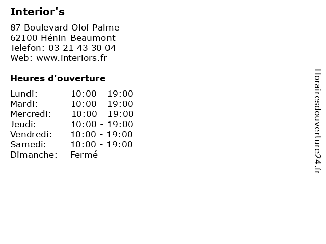 1 Interior's (Distance: 18,13 km) 17 Rue Méaulens, 62000 Arras bureau, chambre, cuisine, decoration, interior's, meuble, salon 2 Aubert (Distance: 0,19 km) . Boulevard Olof Palme, 62110 Henin Beaumont accesories, aubert, bebe, chambre, deco, mode 3 Chambre de Métiers et de l'Artisanat (CMA) (Distance: 9,15 km) 300 Rue François Pilatre de Rozier, 59500 Douai accompagnement, administration, ateliers, chambre, cma, de, et, l'artisanat, métiers, préparation 4 Aubert (Distance: 11,20 km) . Rue James Tobin, 59187 Dechy accesories, aubert, bebe, chambre, deco, mode 5 Aubert (Distance: 12,68 km) . Rue des Poissonniers, 62880 Vendin Le Vieil accesories, aubert, bebe, chambre, deco, mode 6 Aubert (Distance: 20,04 km) . Rue Claude Bernard, 62000 Arras accesories, aubert, bebe, chambre, deco, mode |