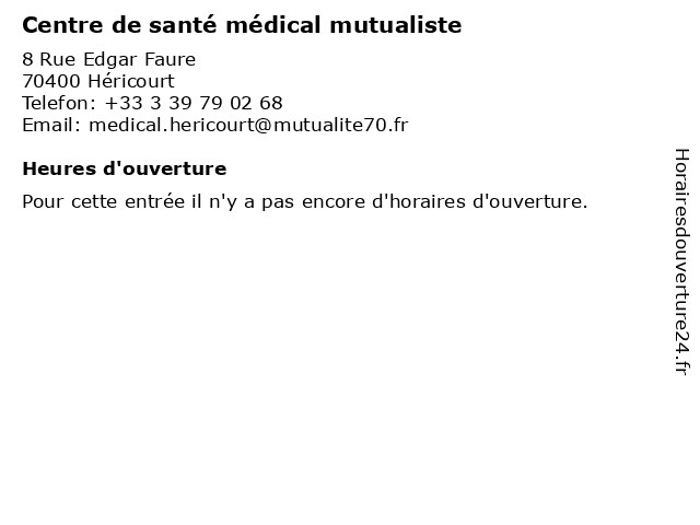 1 Centre de santé dentaire mutualiste (Distance: 0,00 km) 8 Rue Edgar Faure, 70400 Héricourt centre, de, dentaire, mutualiste, santé 2 Écouter Voir - Optique & Audition Mutualiste (Distance: 0,62 km) 4 rue Pierre Mendes France, 70400 Hericourt audition, lunettes, magasin, monture, mutualiste, opticien, optique, voir, écouter 3 Cabinet Médical - Médecine générale (secrétariat ) (Distance: 6,89 km) 51 Rue Gustave Courbet, 25200 Montbeliard cabinet, consultation, docteur, générale, médecine, médical, santé, secrétariat 4 Audition Mutualiste (Distance: 7,78 km) 3 Rue de l'École Française, 25200 Montbéliard accessoires, aides auditives, audioprothésiste, audition, mutualiste, santé 5 Centre de Santé Dentaire Mutualiste (Distance: 7,78 km) 3 Rue de l'École Française, 25200 Montbeliard centre, de, dentaire, docteur, medecins, mutualiste, sante, santé 6 Centre de Santé Dentaire Mutualiste (Distance: 10,33 km) 9 Rue Gambetta, 90000 Belfort centre, de, dentaire, docteur, medecins, mutualiste, sante, santé |