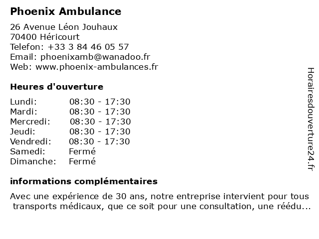1 Le Phoenix (Distance: 8,32 km) 8 Rue de la Libération, 90400 Danjoutin jasm, le, new, phoenix, restaurants 2 Jussieu Secours (Distance: 11,51 km) 8 rue Charles Allemand, 25400 Audincourt ambulance, jussieu, santé, secours, véhicules 3 Ambulance Assistance Maiche (Distance: 36,28 km) 24 Rue du Général de Gaulle, 25120 Maîche ambulance, assistance, maiche 4 Ambulance Tattu Emmanuel (Distance: 39,15 km) 2 Rue du Tatre, 25110 Baume-les-Dames ambulance, emmanuel, tattu 5 Phoenix Tasty (Distance: 42,75 km) 57 Rue Victor Schoelcher, 68200 Mulhouse phoenix, restaurants, tasty 6 |