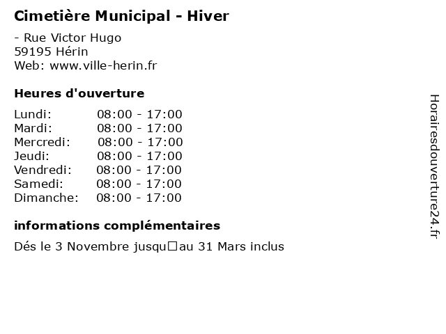 1 Cimetière Municipal - Hiver (Distance: 13,85 km) 190 Rue de l'Égalité, 59199 Hergnies cercueil, cimetiere, cimetière, deuil, hiver, mort, municipal 2 Cimetière Municipal - Eté (Distance: 0,00 km) - Rue Victor Hugo, 59195 Hérin cercueil, cimetiere, cimetière, deuil, eté, mort, municipal 3 Le Kiosque à Pizzas - Hiver - Novembre à Mars (Distance: 4,35 km) - Rue Henri Durre, 59135 Wallers hiver, kiosque, le, mars, novembre, pizza, pizzas, pizzeria, rapide, restaurant, restauration 4 Déchèterie (Hiver) (Distance: 11,81 km) - de Solesmes, 59213 Bermerain déchèterie, gravats, hiver, huiles usées, la réception des déchets et écocentres, les appareils électroménagers, les déchets verts, papier et carton en quantité 5 Déchèterie (Hiver ) (Distance: 13,35 km) - Rue César Dewasmes, 59690 Vieux-Condé déchèterie, gravats, hiver, huiles usées, la réception des déchets et écocentres, les appareils électroménagers, les déchets verts, papier et carton en quantité 6 Déchèterie (Hiver ) (Distance: 13,40 km) 1372-1412 Rue Fernand Rombeau, 59870 Rieulay benne, débarras, déchets, déchèterie, détritus, hiver  |