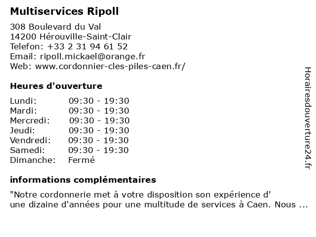 1 Multiservices (Distance: 0,27 km) . Saint Clair, 14200 Herouville Saint Clair accessoires, beaute&sante, cafe, chaussures, enfants, mode femmes, mode hommes, multiservices, optique, restaurant, service, sport 3 SRIM Multiservices (Distance: 12,44 km) 155 rue de l’Ormelet, 14790 Mouen boutique, diogène, débarras, entretien, multiservice, multiservices, nettoyage général, poubelles, propreté, srim 4 Serrurier Multiservices (Distance: 27,50 km) 27 place du Maréchal Leclerc, 14310 Villers-Bocage dépannage, multiservices, porte, réparation, serrurier, service 5 Menuiserie Delalande Multiservices (Distance: 29,08 km) Route de la Rouelle, 14260 Bonnemaison delalande, menuiserie, multiservices 6 SRIM Multiservices (Distance: 45,52 km) 8 Rue Ernest Renan, 76600 Le Havre boutique, diogène, débarras, entretien, multiservices, nettoyage général, poubelles, propreté, srim |