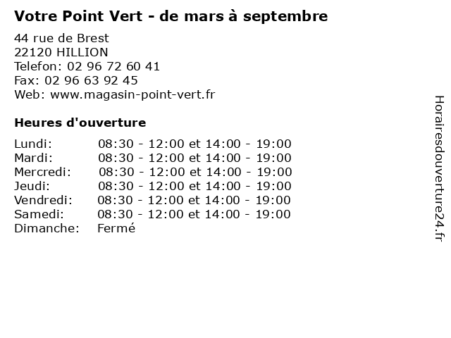 | Samedi | 08:30-12:00 et 14:00-19:00 |