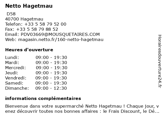 2 Netto (Distance: 0,17 km) - ZI Montplaisir, 40700 Hagetmau achats de produits alimentaires, des prix bas, grands supermarchés, hard discount, netto, supermarchés 5 Netto (Distance: 15,96 km) - Saint-Sever, 40500 Saint-Sever achats de produits alimentaires, des prix bas, grands supermarchés, hard discount, netto, supermarchés 6 Netto (Distance: 20,86 km) - Avenue du 8 mai 1945, 64300 Orthez achats de produits alimentaires, des prix bas, grands supermarchés, hard discount, netto, supermarchés |