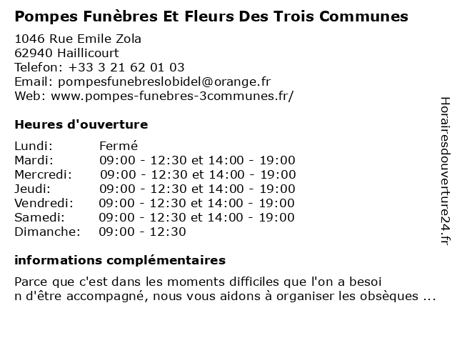 1 Pompes Funèbres Roc-Eclerc (Distance: 1,53 km) 128 Rue Roger Salengro, 62700 Bruay-la-Buissière articles funéraires, assistance rapatriement, démarches admnistratives, eclerc, fleurs fraîches, funèbres, gestion des obsèques, pompes, prévoyance obsèques, roc, travaux de marbrerie et cimetière 2 Pompes Funèbres Houdinoises Foulon (Distance: 2,16 km) 5 rue Henri Durant, 62150 Houdain foulon, funèbres, houdinoises, pompes 3 Pompes Funébres Des 3 Communes (Distance: 2,19 km) 16 Rue de la Libération, 62940 Haillicourt communes, des, funébres, pompes 4 Pompes Funèbres EDDY BURIEZ (Distance: 2,32 km) 907 Rue de la République, 62700 Bruay-la-Buissière buriez, eddy, funèbres, pompes 5 Pompes Funèbres EDDY BURIEZ (Distance: 3,93 km) 19 Rue d'Haillicourt, 62620 Barlin buriez, eddy, funèbres, pompes 6 |