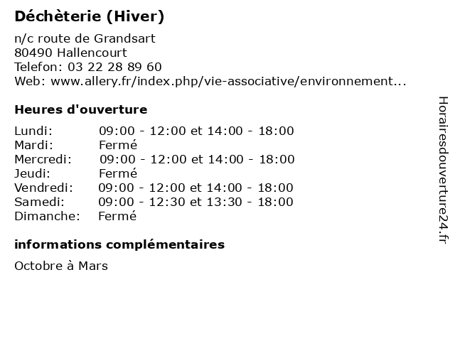 1 Déchèterie (Eté) (Distance: 0,00 km) n/c route de Grandsart, 80490 Hallencourt avril, débarras, déchets, déchèterie, eté, poubelles, septembre 2 Déchèterie - Avril à Septembre (Distance: 6,37 km) - Za les Croisettes, 80132 Huchenneville avril, bennes, déchèterie, détritus, ménagers, ordures, poubelle, septembre 3 Déchèterie - Octobre à Mars (Distance: 6,37 km) - Za les Croisettes, 80132 Huchenneville bennes, déchèterie, détritus, mars, ménagers, octobre, ordures, poubelle 4 Déchèterie (Distance: 10,29 km) - rue Brumaire, 80100 Abbeville déchèterie, gravats, huiles usées, la réception des déchets et écocentres, les appareils électroménagers, les déchets verts, papier et carton en quantité 5 Déchèterie - Avril à Septembre (Distance: 17,00 km) n/c route de Saint-Riquier, 80620 Domqueur avril, bennes, déchèterie, détritus, ménagers, ordures, poubelle, septembre 6 Déchèterie (Distance: 18,40 km) - Lieu-dit Le Marais Communal, 80610 Saint-Ouen débarras, déchets, déchèterie, poubelles |