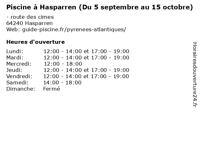 1 Piscine à Hasparren (Du 1 juin au 1 juillet) (Distance: 0,00 km) - route des cimes, 64240 Hasparren au, du, hasparren, juillet, juin, natation sportive, piscine, sportif 2 Piscine à Hasparren (Du 2 juillet au 31 août) (Distance: 0,00 km) - route des cimes, 64240 Hasparren 31, août, au, du, hasparren, juillet, natation sportive, piscine, sportif 3 Etxeko Bob’s Beer - Septembre à Juin (Distance: 4,18 km) 69 Rue Francis Jammes, 64240 Hasparren artisanale, beer, bière, bières, bob’s, brasserie, etxeko, juin, septembre 4 Piscine à Cambo les Bains (Septembre) (Distance: 4,27 km) - avenue d'Espagne, 64250 Cambo-les-Bains bains, cambo, les, natation sportive, piscine, septembre, sportif 5 La Forêt des Lapins (15 Juin à Septembre) (Distance: 7,13 km) - Chemin d'Agorreta, 64250 Itxassou 15, 30, animalier, au, cochons, d'inde, des, forêt, juin, la, lapins, parc, septembre, zoo 6 La Forêt des Lapins (Octobre au 14 Juin) (Distance: 7,13 km) - Chemin d'Agorreta, 64250 Itxassou 14, animalier, au, cochons, d'inde, des, forêt, juin, la, lapins, octobre, parc, zoo |