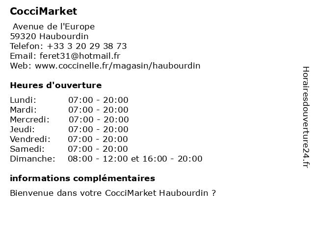 1 CocciMarket (Distance: 2,93 km) 21-23 Rue du Général Leclerc, 59120 Loos alimentation, boisson, charcuterie, coccimarket, supermarché, épicerie 3 CocciMarket (Distance: 9,89 km) 20 Rue Faidherbe, 59116 Houplines alimentation, coccimarket, magasin, superette, supermarché, épicerie 4 Coccimarket (Distance: 11,08 km) 5001F Route d''Armentières, 59236 Frelinghien alimentation, coccimarket, fruits, legumes, superette 5 Coccimarket (Distance: 11,73 km) 55 Rue Corneille, 59650 Villeneuve-d'Acq coccimarket, liquor, market, supermarket 6 CocciMarket (Distance: 13,79 km) 37 Rue Edouard Plachez, 62220 Carvin alimentation, coccimarket, magasin, superette, supermarché, épicerie |