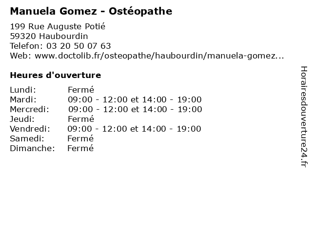 1 Manuela Gomez - Ostéopathe (Distance: 4,04 km) 29 Avenue de Boufflers, 59130 Lambersart gomez, manuela, osteo, osteopathe, ostéopathe, sante, soins 2 Manuela Jimenez - Camille Wibaut (Distance: 9,60 km) 68 Rue du Général Leclerc, 59650 Villeneuve-d'Ascq camille, jimenez, manuela, wibaut 3 Saraiva Maria Manuela (Distance: 17,15 km) 36 Rue Paul Doumer, 59200 Tourcoing agents, assurance, assurances, courtiers, manuela, maria, saraiva, services 4 Dr Manuela Tode - Gastro-entérologue et hépatologue (Distance: 42,01 km) 15 Rue Jean-Jacques Rousseau, 59220 Denain cabinet, consultation, docteur, dr, entérologue, et, gastro, hépatologue, manuela, médecins, médical, santé, secrétariat, tode 5 Pierrick Gomez (Distance: 59,21 km) 2 rue de l'abbaye, 59730 Solesmes brushing, coiffage, coiffure, coloration, coupe, gomez, pierrick 6 Marie-Anne Chalvardjian - Kinésiologue (Distance: 0,09 km) 228 Rue Sadi Carnot, 59320 Haubourdin anne, chalvardjian, kinesiologie, kinésiologue, marie, naturopathe, praticienne, reiki, soins energetiques |