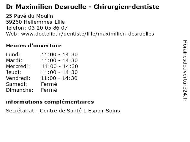 1 Dr Maximilien Desruelles - Chirurgien-dentiste (Distance: 0,15 km) 25 Pavé du Moulin, 59800 Lille chirurgien, chirurgien-dentiste, dentiste, desruelles, dr, maximilien, médecins, médicaments, santé, secrétariat, spécialiste 2 Maître Maximilien Longue-Épée - Avocat (Distance: 5,42 km) 113 rue de Jemmapes, 59000 Lille avocat, avocats, civils, droits, epee, juridiques, longue, maximilien, maître, épée 3 Monsieur Maximilien Blanquet (Distance: 30,55 km) 62 Rue Fernand, 59490 Somain blanquet, maximilien, restaurants 4 Dr Siew-Beau Ponseel - Chirurgien-dentiste (Distance: 0,00 km) 25 Pavé du Moulin, 59260 Hellemmes-Lille beau, chirurgien, consultation, dentiste, docteur, dr, med, médecin, ponseel, siew, traitement 5 Dr Yassine Bulaid - Chirurgien orthopédiste et traumatologue (Distance: 1,45 km) 10 boulevard Bizet, 59009 Villeneuve d'Asq bulaid, chirurgien, dr, et, medecin, ortho, orthoptiste, orthopédiste, sante, traumatologue, yassine 6 Dr Quentin Daquet - Chirurgien-dentiste (Distance: 3,62 km) 70 Rue de Douai, 59000 Lille chirurgien, chirurgien-dentiste, daquet, dentiste, dr, médecins, médicaments, quentin, santé, secrétariat, spécialiste |