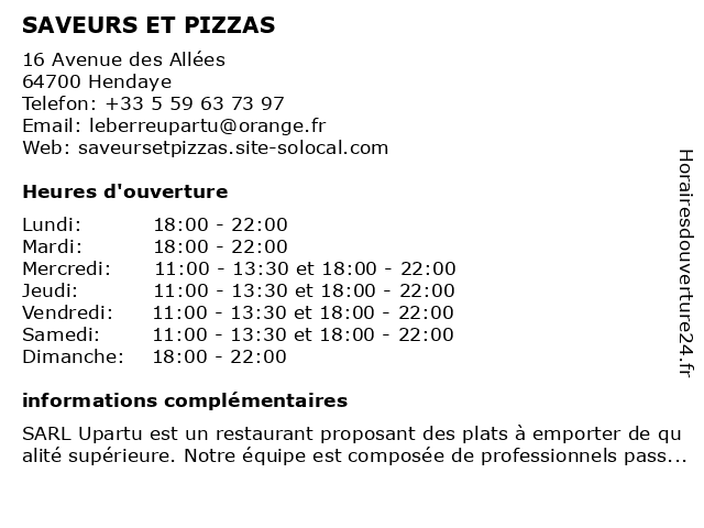| Samedi | 11:00-13:30 et 18:00-22:00 |
