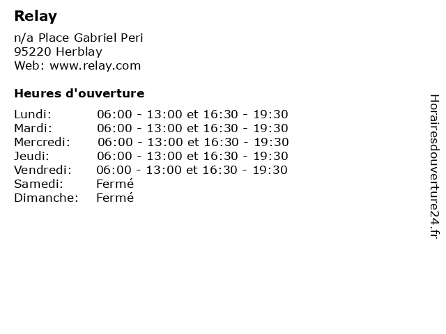1 Relay (Distance: 1,81 km) n/a Place de la Gare, 78500 Sartrouville beverages, food, gifts, paper, printing, relay, service products, telephone 2 Relay (Distance: 1,81 km) n/a Place de la Gare, 78260 Acheres beverages, food, gifts, paper, printing, relay, service products, telephone 3 Relay (Distance: 4,61 km) n/a R.Fours A Chaux, 78700 Conflans Saint Honorine beverages, food, gifts, paper, printing, relay, service products, telephone 4 Relay (Distance: 5,39 km) n/a Place de la Gare, 95130 Franconville beverages, food, gifts, paper, printing, relay, service products, telephone 5 Relay (Distance: 6,60 km) n/a Saint-Germain-en-Laye, 78100 Saint-Germain-en-Laye beverages, food, gifts, paper, printing, relay, service products, telephone 6 Relay (Distance: 7,28 km) , Rue du Général Leclerc,, 95310 Saint-Ouen-l'Aumône beverages, food, gifts, paper, printing, relay, service products, telephone  |